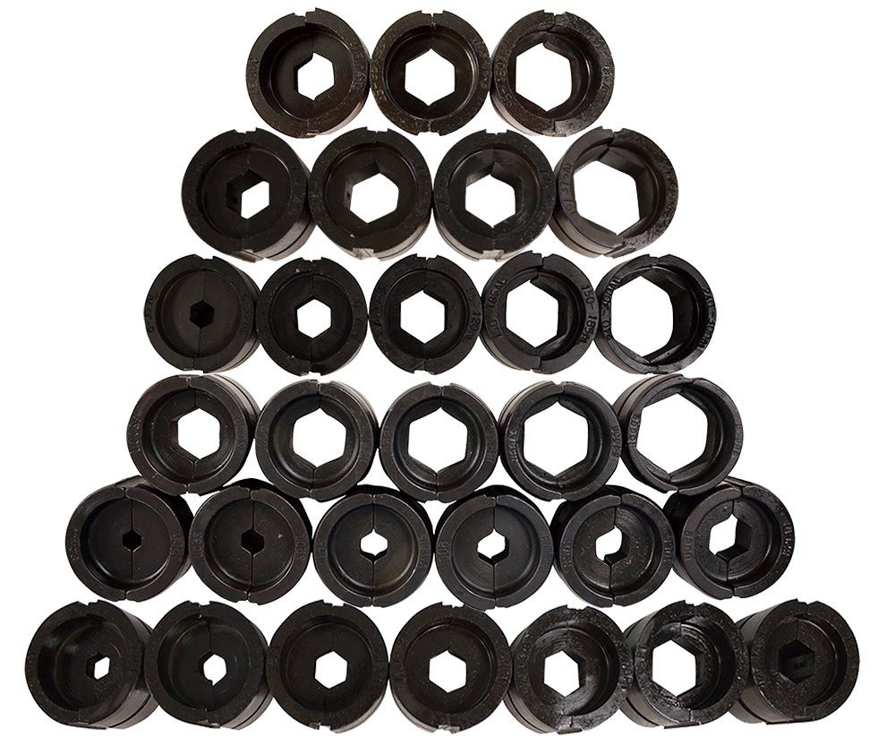 - Includes 13 aluminium dies ranging from 6 to 300 mm² and 17 copper lug dies ranging from 16 to 300 mm²