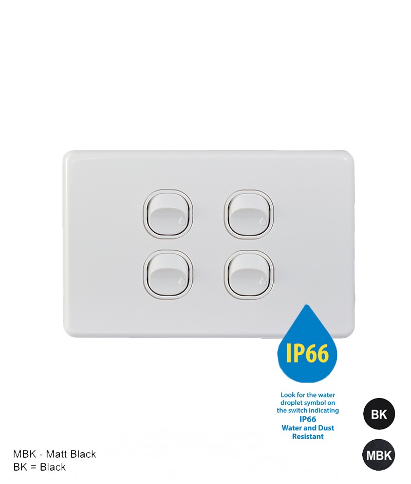 4 gang waterproof switch with 10AX 250V rating and IP66 protection—ideal for outdoor residential and commercial use. Built for durability, with UV stabilized plastic and surface mount design.