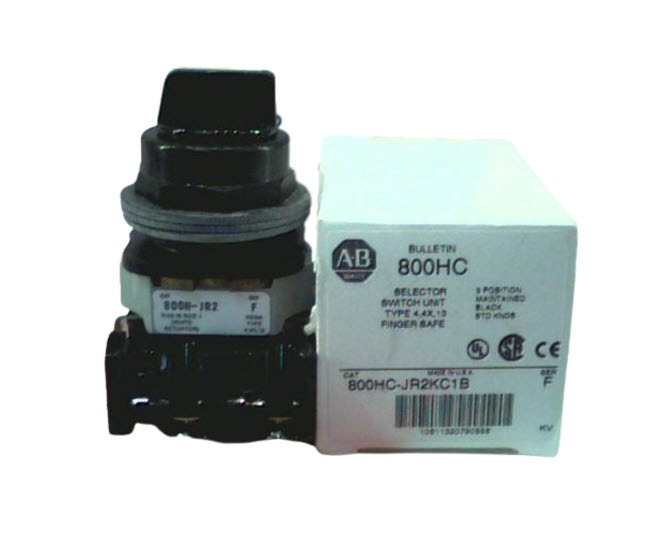 The Allen-Bradley 800HCJR2KC1B Selector Switch is a 3-position maintained switch with a standard knob and KC1 cam, designed for reliable industrial control applications.