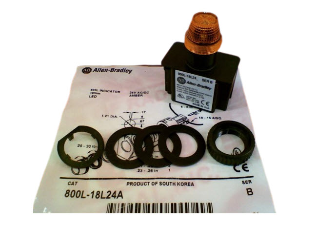 The Allen-Bradley 800L18L24A Amber LED Pilot Indicator Light is available for immediate purchase, ideal for industrial and automation control panel applications.