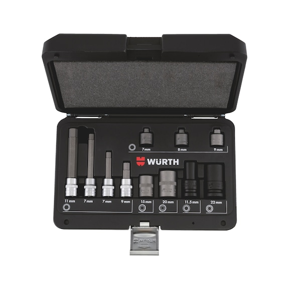 - Includes hexagon sockets (7, 8, 9 mm) and special profiles (11.5, 15, 20, 22 mm)