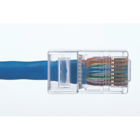 CAT5e Feed-Thru RJ45 connectors in a convenient 100 pack, designed for quick verification of conductor order before crimping. Ideal for data communication networks and PoE applications, these connectors feature 50 micro-inch gold plating for long-term reliability and compatibility with solid or stranded cables.