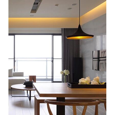 CAVIAR pendant light with 40W power and gold dimpled interior—ideal for stylish indoor settings. Built for elegance, with a black Mexican hat shape and adjustable 3000mm suspension cable.