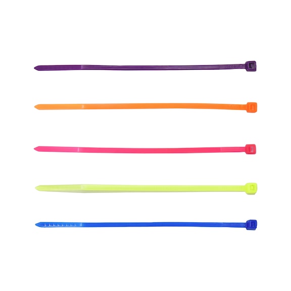 - Assortment of 100 cable ties in 5 colours: Blue, Purple, Yellow, Pink, Orange