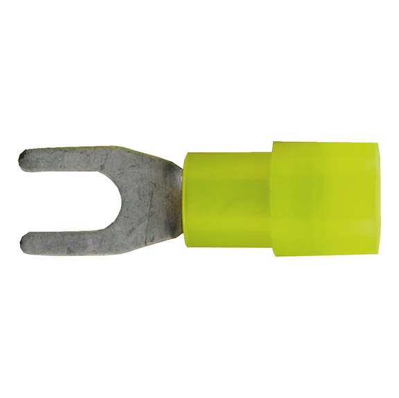 Crimp cable lug fork shape with polyamide insulation and M4 flange hole—ideal for secure electrical connections. Designed for industrial and automotive applications, this yellow lug ensures reliable cable termination even under temperature fluctuations, making it a perfect choice for professionals.