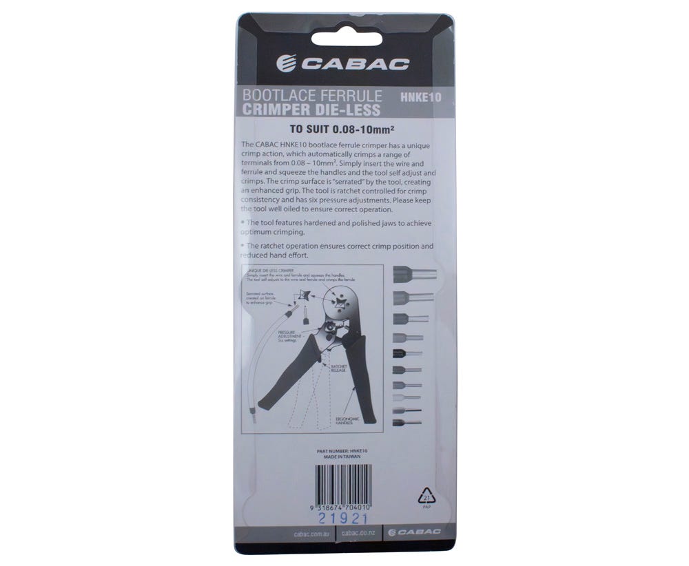 The Cabac Die-less Bootlace Crimper 0.08-10mm2 is available now for immediate purchase. Ideal for electricians and electrical contractors requiring reliable crimping tools.