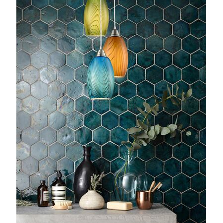 - Satin nickel hardware with hand blown glass shade