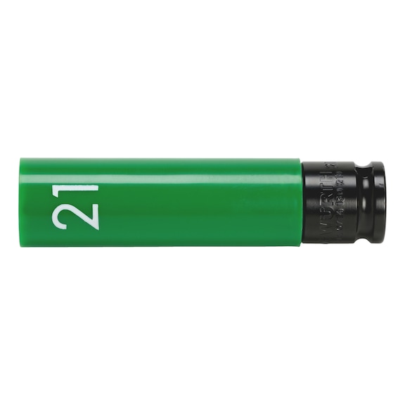 The 1/2 inch impact socket wrench insert is designed for deep-seated wheel nut removal and installation, featuring an extra long design for safe access. With a rotatable plastic sleeve to protect aluminum rims and a colour guide system for easy identification, this tool is perfect for automotive and industrial applications. Built from durable steel, it ensures longevity and reliability in mechanical workshops and maintenance tasks.