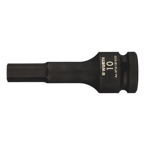 The 1/2-inch impact socket wrench insert is designed for hexagon socket screws, featuring a durable forged steel construction and a burnished finish. Ideal for automotive and industrial maintenance, it fits all conventional compressed air and electric drivers, ensuring reliable performance and longevity.