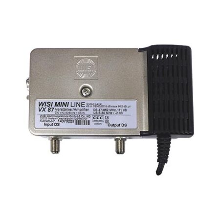 In house distribution amplifier with 5-862 MHz frequency range and adjustable level and equalizer—ideal for reducing 4G interference. Built for home and commercial use, with wall mounting and metal housing for durability.