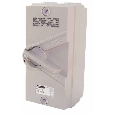 Isolator switch with single pole and 35A capacity—ideal for air conditioners and various isolating needs. Built for durability, with 250V rating and IP56 protection for reliable performance.