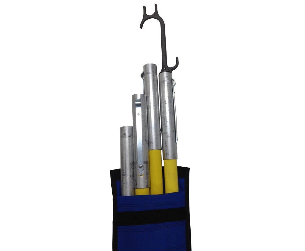 The Lay Up Stick Set - 5Pce with Carry Bag is designed for electrical line work, featuring 4 interchangeable fiberglass sticks with a total height of 6.3m and a dielectric strength of at least 25kV/in. Ideal for utility and telecommunications maintenance, this kit includes a wire raising tool and a heavy-duty canvas carry bag for easy transport and storage.