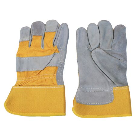 Safety gloves with natural split leather palm and knuckle bar, offering abrasion and puncture resistance—ideal for construction and industrial use. Built for durability, with a large rubber cuff and yellow cotton drill back for added wrist protection.