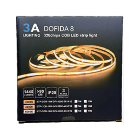 LED COB Strip Light with 6W power and 320 LEDs per meter is perfect for indoor lighting applications. Designed to provide high brightness with low power consumption, this 10-meter strip features a neutral white 4000K color temperature and a high CRI of 90+ for excellent color rendering. Ideal for architectural and accent lighting, it ensures a seamless lighting experience without multi-shadows.