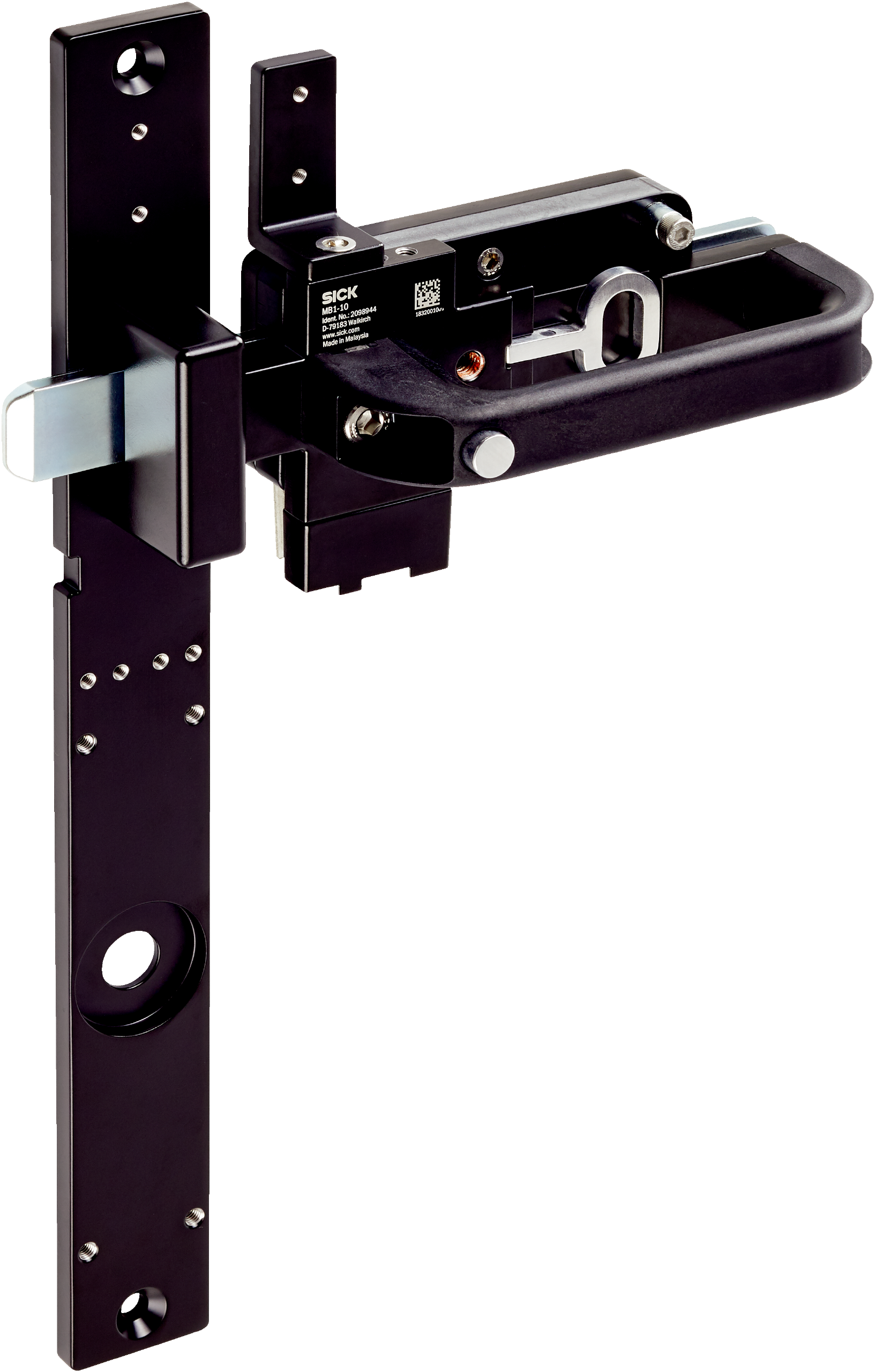 The SICK MB1-BL10 is a complete actuator and bolt set designed for safety locking applications with i10, i110, and TR110 Lock safety switches, featuring a catch release button and ANSI-compliant locking mechanism.