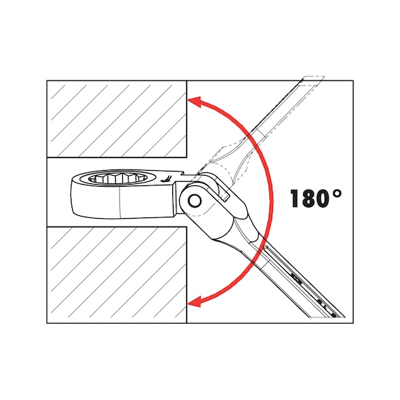- Special tool with 180° joint and ratchet on box end for flexibility