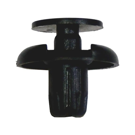 Push in rivet without cap designed for sheet metal fastening, featuring high retention force and easy installation. Ideal for automotive assembly and repair, this black plastic fastener ensures a secure fit in components, making it perfect for vehicle body panel attachment.