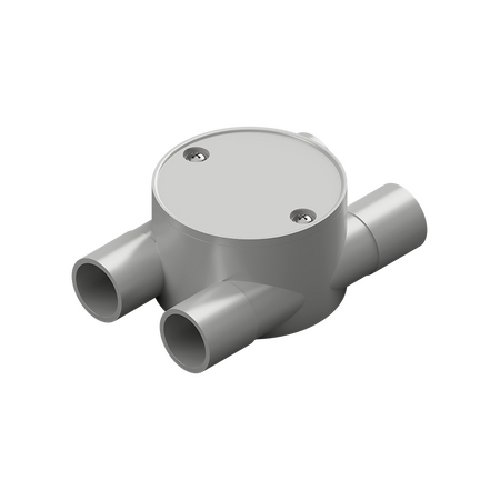 PVC 4-way shallow junction box with 20mm entry size—ideal for residential and commercial wiring. Built for efficient cable management, with durable grey PVC construction and easy installation in tight spaces.