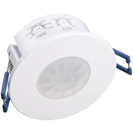 Recessed infrared motion sensor with 360° detection and 220-240V voltage—ideal for energy-efficient lighting control. Built for versatile installations, with adjustable ambient light settings and a wide detection range.
