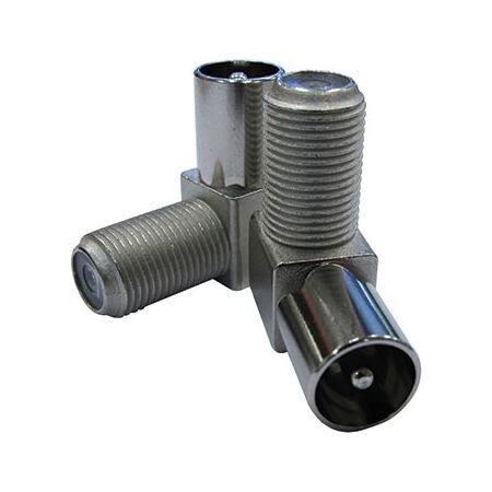 Right angle coaxial adaptor converting 'F' female to IEC male, supporting up to 2.5GHz—ideal for tight spaces in residential and commercial setups. Built for reliable signal integrity, with easy installation.