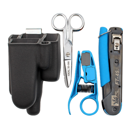 - Includes FT-45 Feed-Thru Modular Plug Crimp Tool (30-495), PrepPRO Cable Stripper (45-605), Electrician’s Scissors (35-088), and Clip-On Pouch