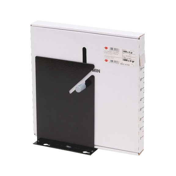 The Roll Goods Storage Box is designed for automotive workshops, featuring a durable steel construction and a compact design that requires only 8 x 16 cm for mounting. Ideal for organizing zinc and steel roll weights, this space-saving solution ensures efficient use of roll goods while keeping your workstation tidy and accessible.