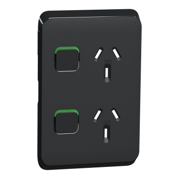 Alternatively Known As: Clipsal Iconic Double Power Point Cover, Vertical Socket Skin, Iconic Black Power Point Cover, Clipsal 3025VC-XB, Double GPO Cover Plate