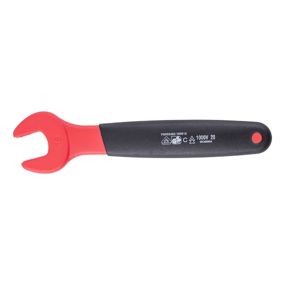 - Insulated VDE open-end wrench suitable for working around live parts