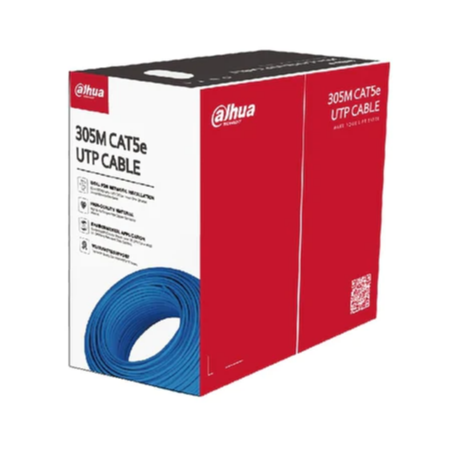 UTP CAT5e cable with 305m length and power over Ethernet capability—ideal for network installations. Built for high performance, with oxygen-free copper conductor and flame-retardant PVC sheath.